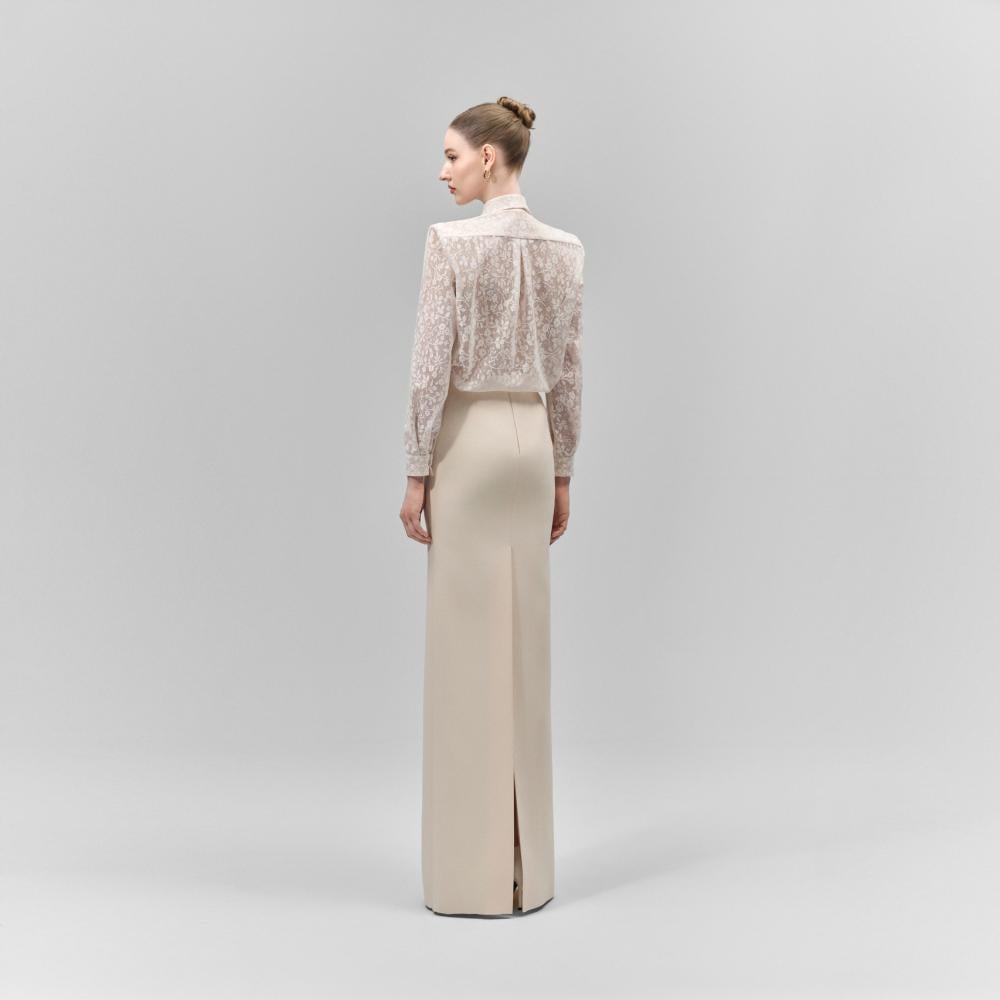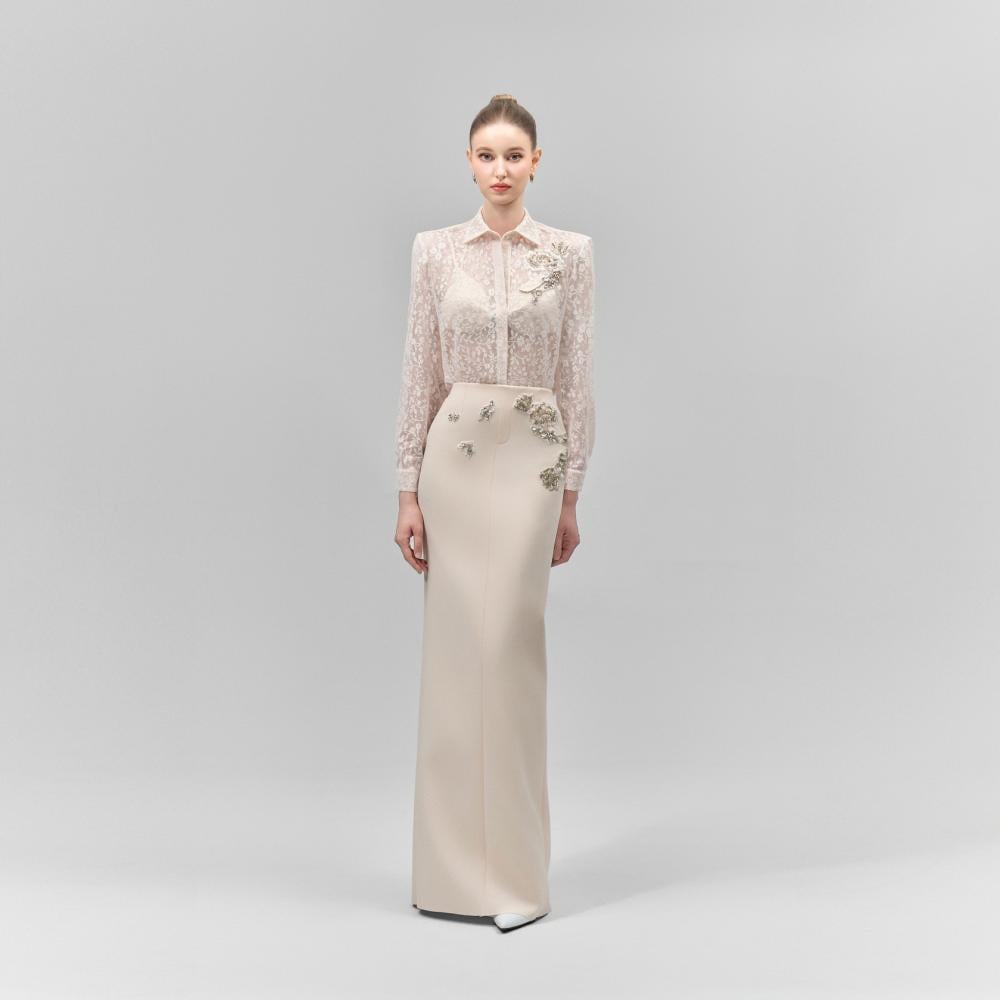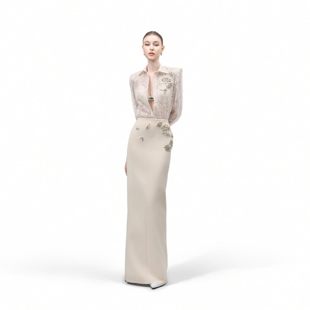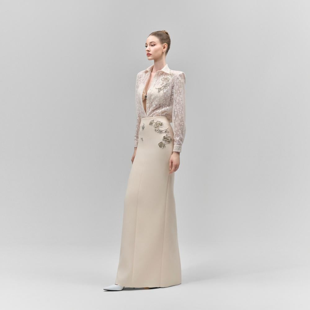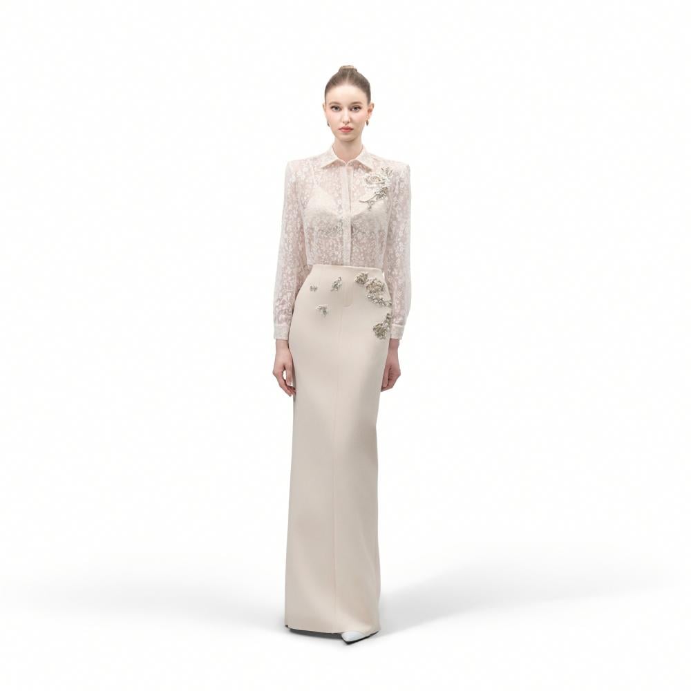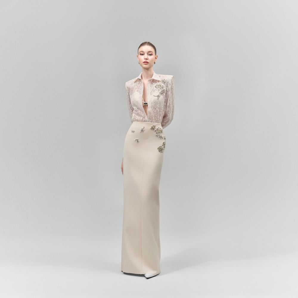 تألقي بمظهر استثنائي وفاخر مع هذه التنورة التي تمتلك تصميماً ساحراً، صنعت هذه التنورة باتقان لتناسب مظهرك العام، هذه التنورة الأنيقة تتوفر باللون الكريمي، تعد خياراً مناسباً دائماً لأي مناسبة.