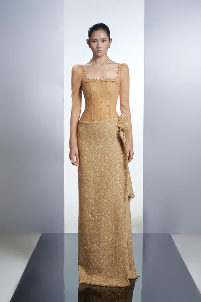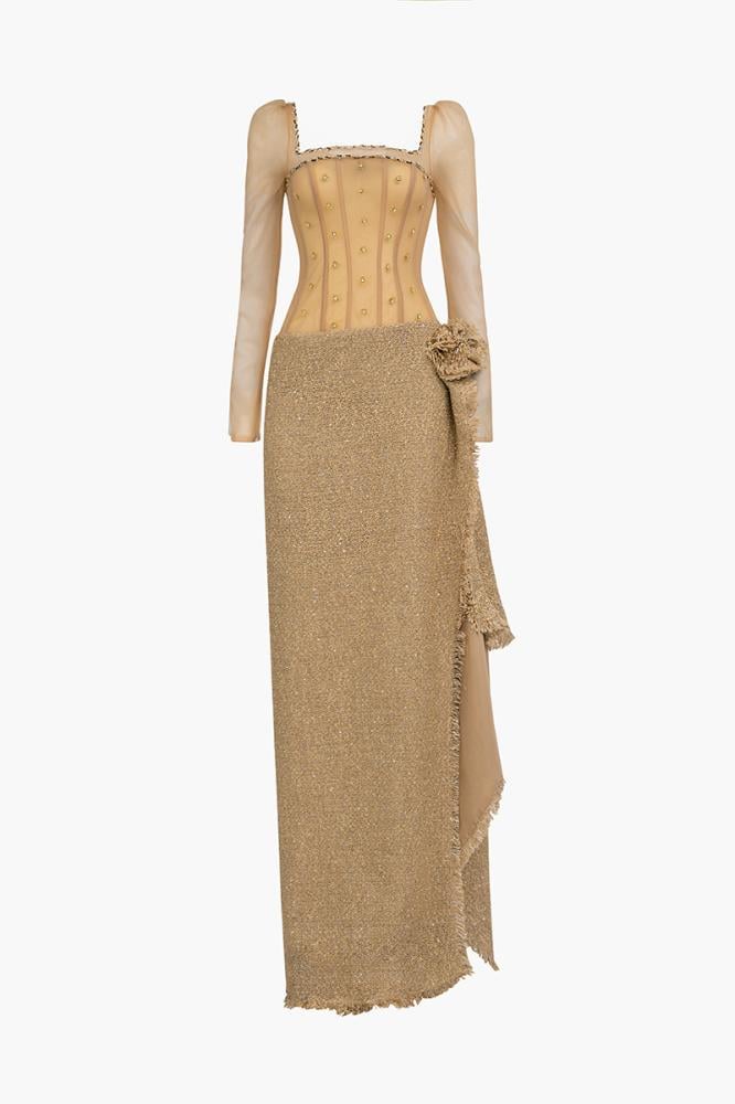 تألقي بمظهر استثنائي وفاخر مع هذا الفستان الذي يمتلك تصميماً ساحراً، صنع هذا الفستان باتقان ليناسب مظهرك العام، هذا الفستان الأنيق يتوفر باللون البيج، يعد خياراً مناسباً دائماً لأي مناسبة.