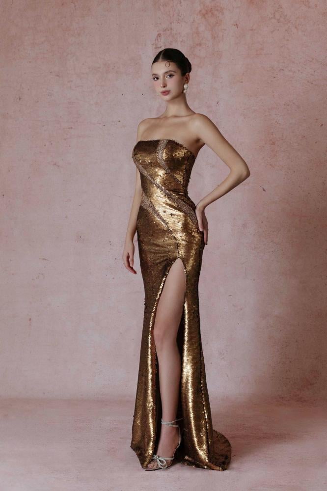 تألقي بمظهر استثنائي وفاخر مع هذا الفستان الذي يمتلك تصميماً ساحراً، صنع هذا الفستان باتقان ليناسب مظهرك العام، هذا الفستان الأنيق يتوفر باللون الذهبي اللامع، يعد خياراً مناسباً دائماً لأي مناسبة.