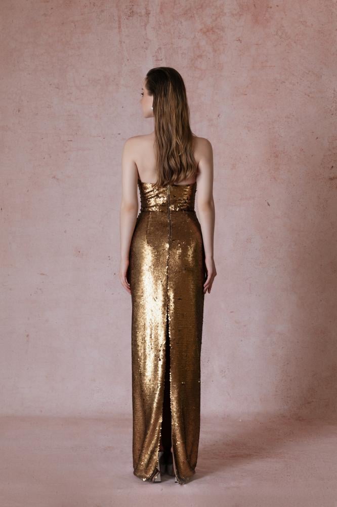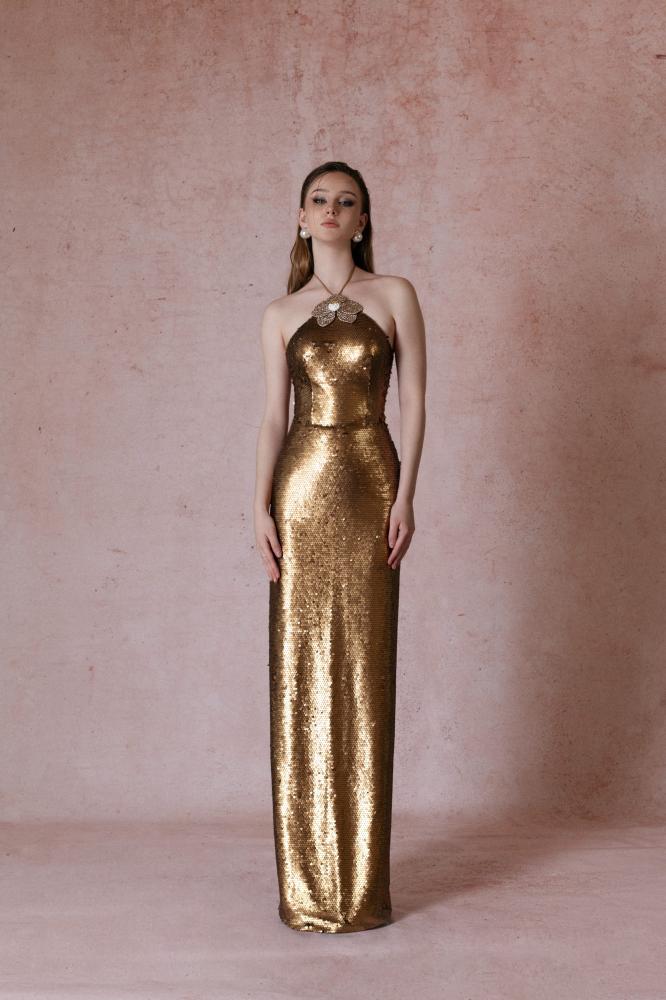 تألقي بمظهر استثنائي وفاخر مع هذا الفستان الذي يمتلك تصميماً ساحراً، صنع هذا الفستان باتقان ليناسب مظهرك العام، هذا الفستان الأنيق يتوفر باللون الذهبي اللامع، يعد خياراً مناسباً دائماً لأي مناسبة.
