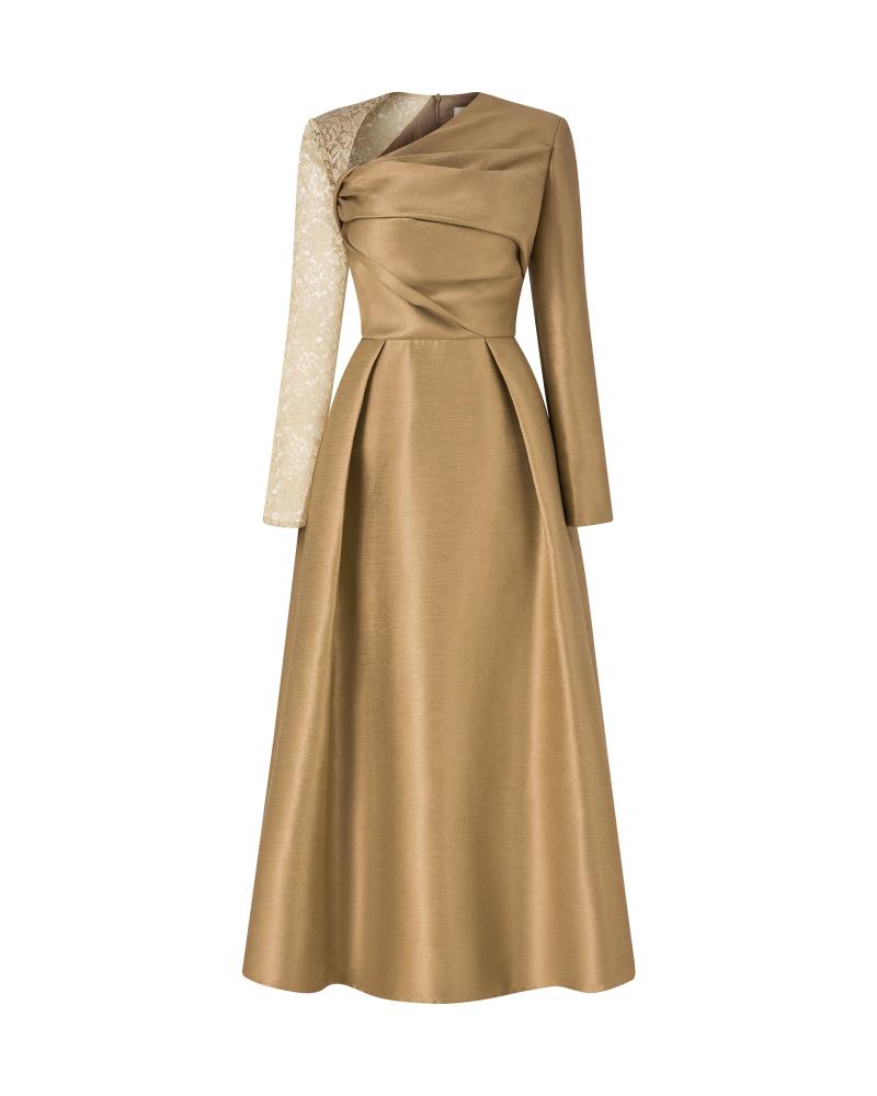 تألقي بمظهر استثنائي وفاخر مع هذا الفستان الذي يمتلك تصميماً ساحراً، صنع هذا الفستان باتقان ليناسب مظهرك العام، هذا الفستان الأنيق يتوفر باللون الذهبي البني، يعد خياراً مناسباً دائماً لأي مناسبة.