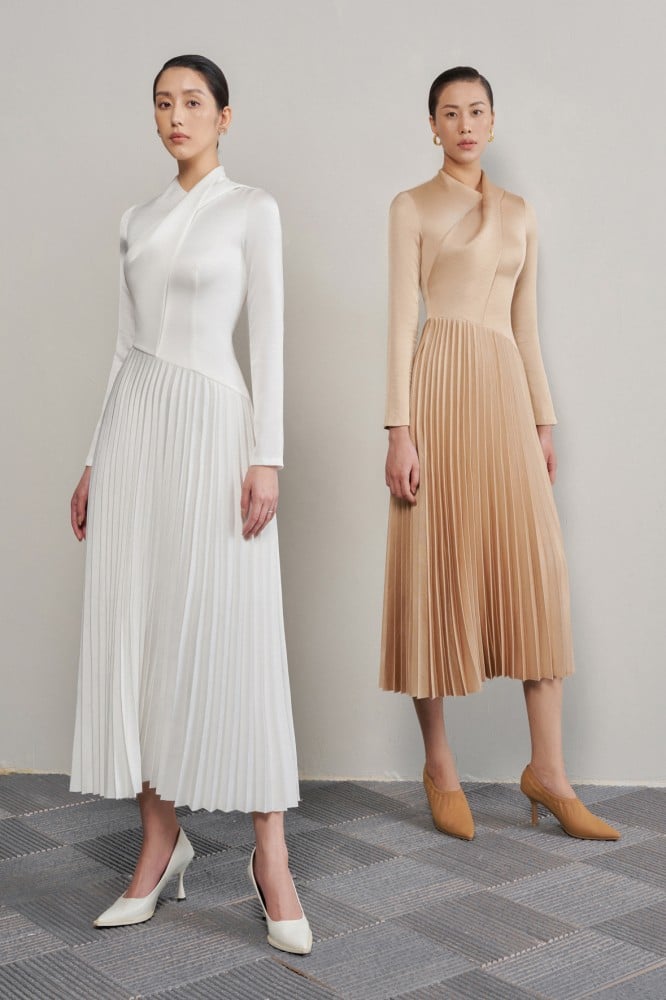 Shine with an exceptional and luxurious look with this dress, which has a charming design. This dress was made to perfection to suit your general appearance. This elegant dress is available in beige and white. It is always a suitable choice for any occasion.