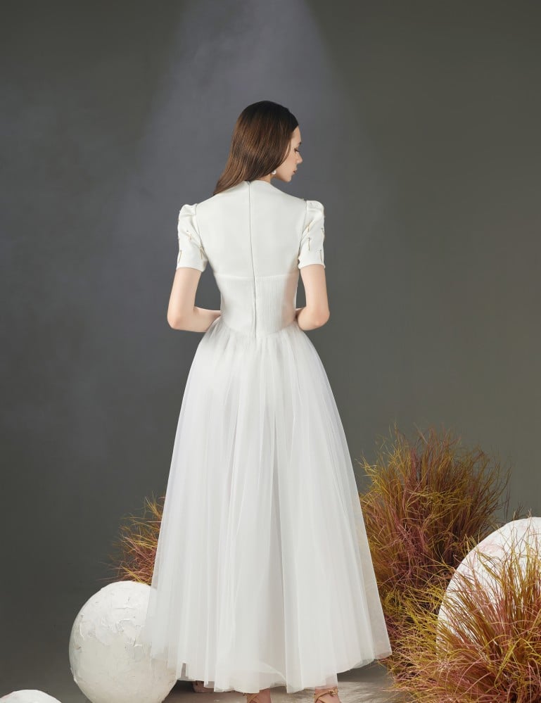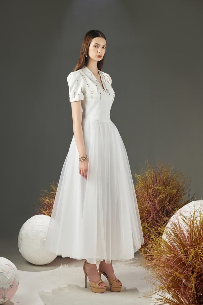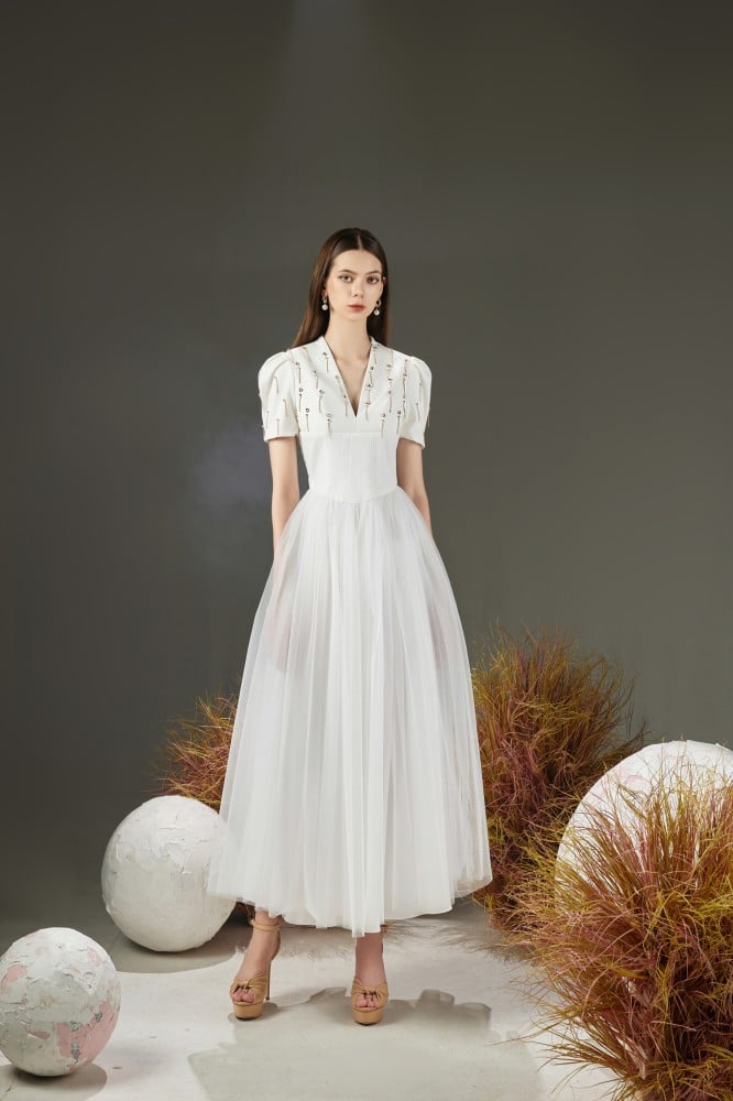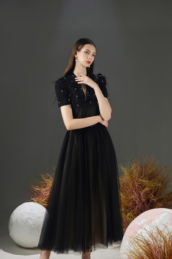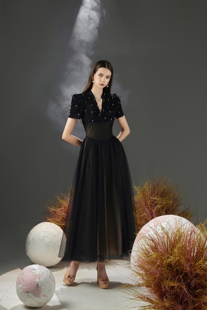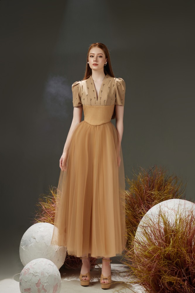 • Made of luxurious taffeta, mesh and organza materials.