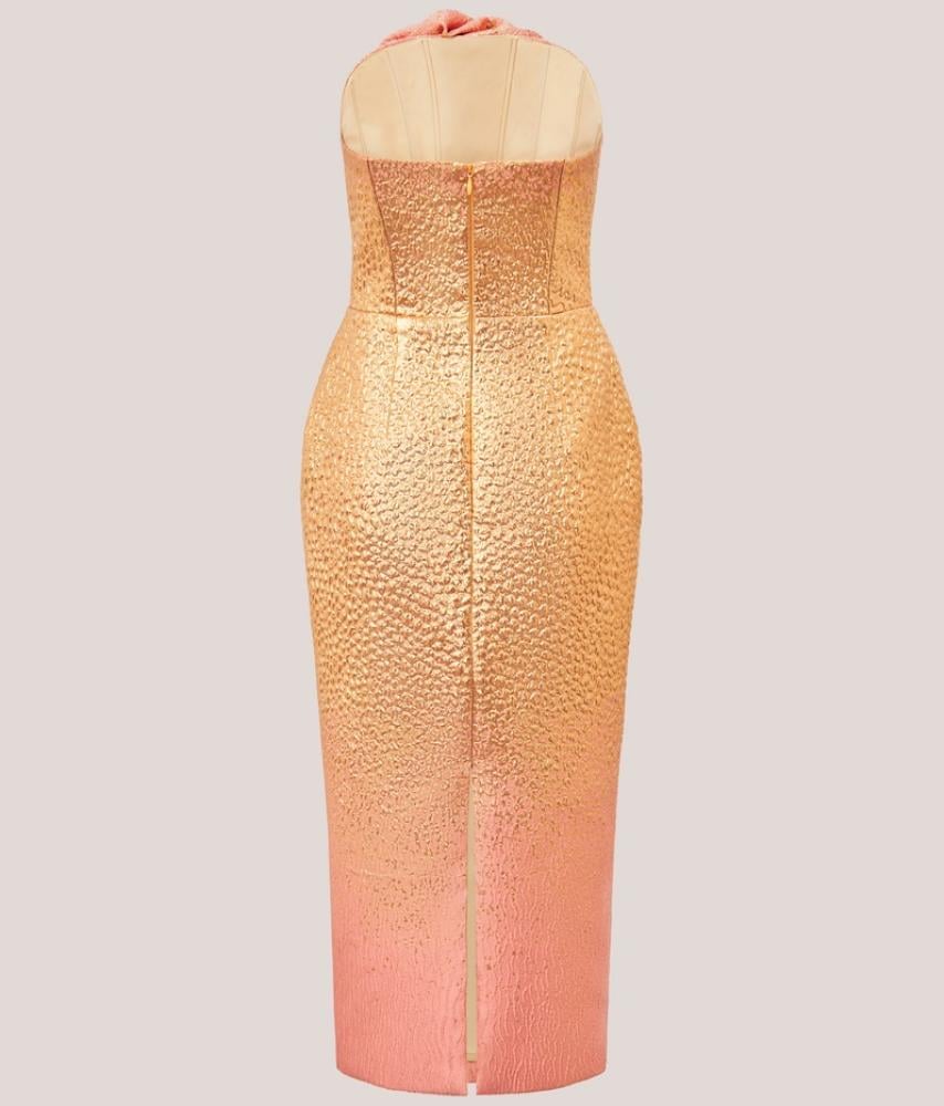 Shine with an exceptional and luxurious look with this dress, which has a charming design. This dress is expertly crafted to suit your overall look. This elegant dress is available in a pink-orange gradient color, making it a suitable choice for any occasion.