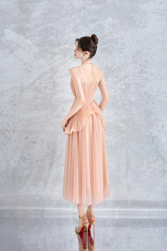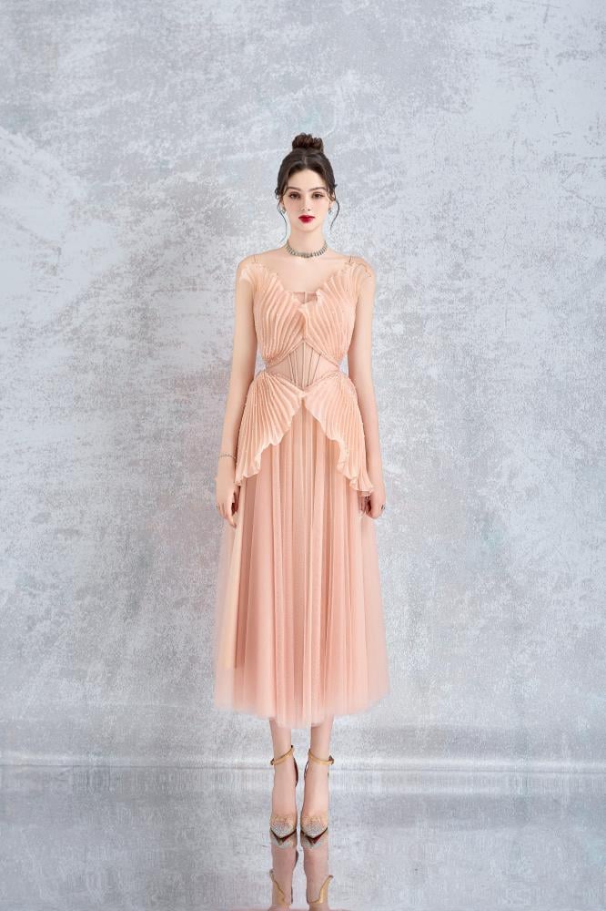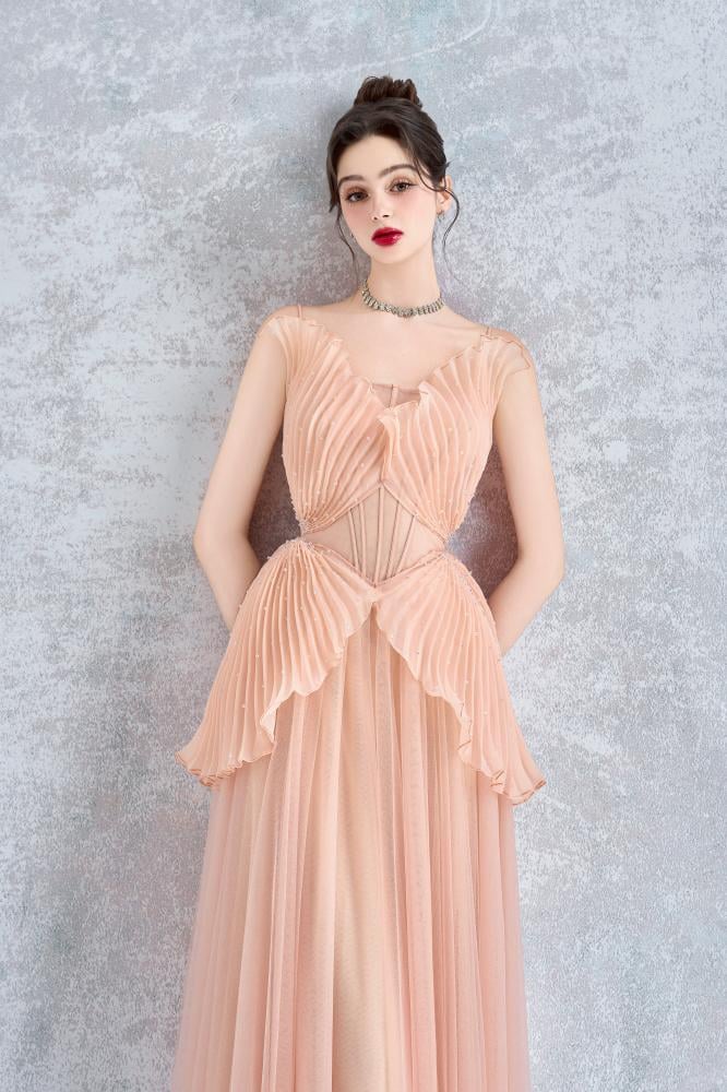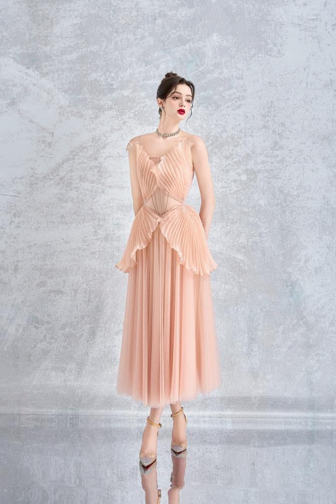 Shine with an exceptional and luxurious look with this dress, which has a charming design. This dress is expertly crafted to suit your overall look. This elegant dress is available in apricot, making it a suitable choice for any occasion.